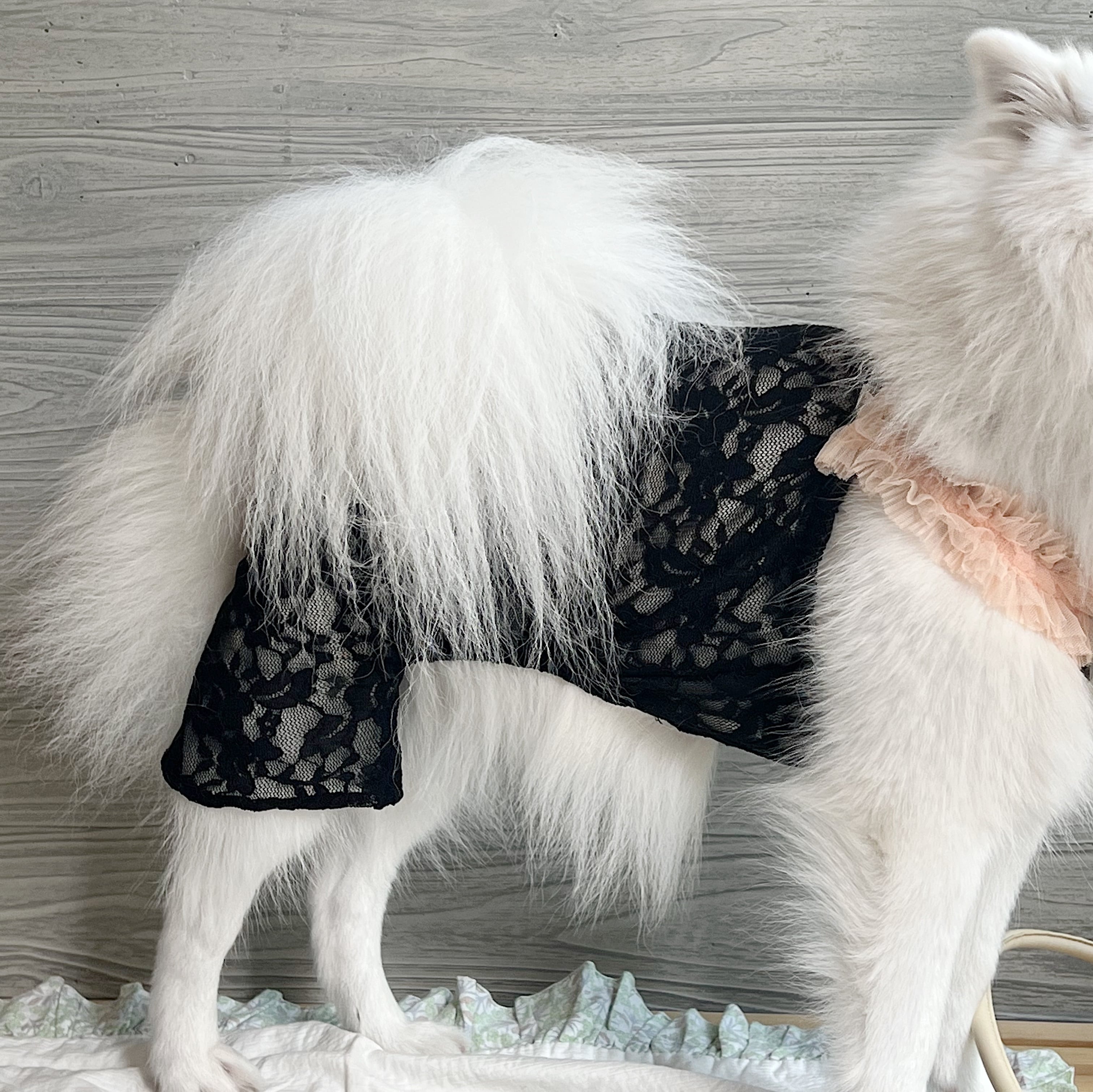 パッと見からとにかく可愛い!クラシカルな総レースを使用したドッグロンパース♡